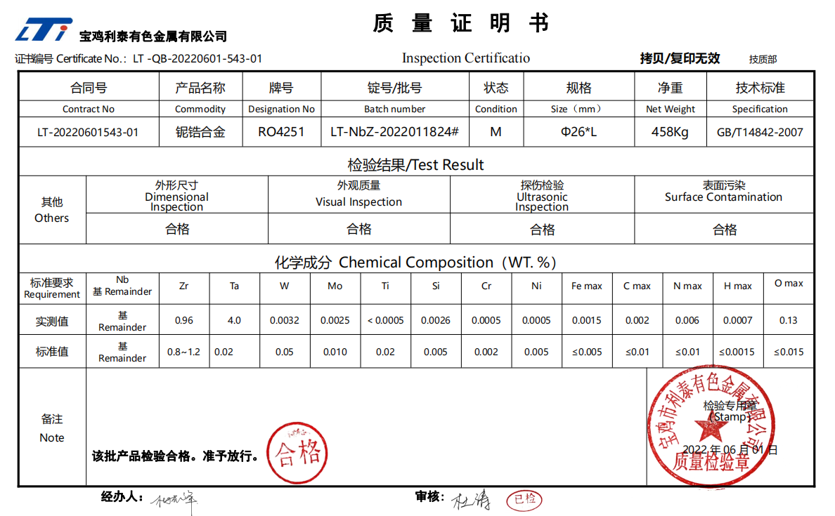 四、鈮鋯合金(Nb-Zr1)質(zhì)量檢測數(shù)據(jù)